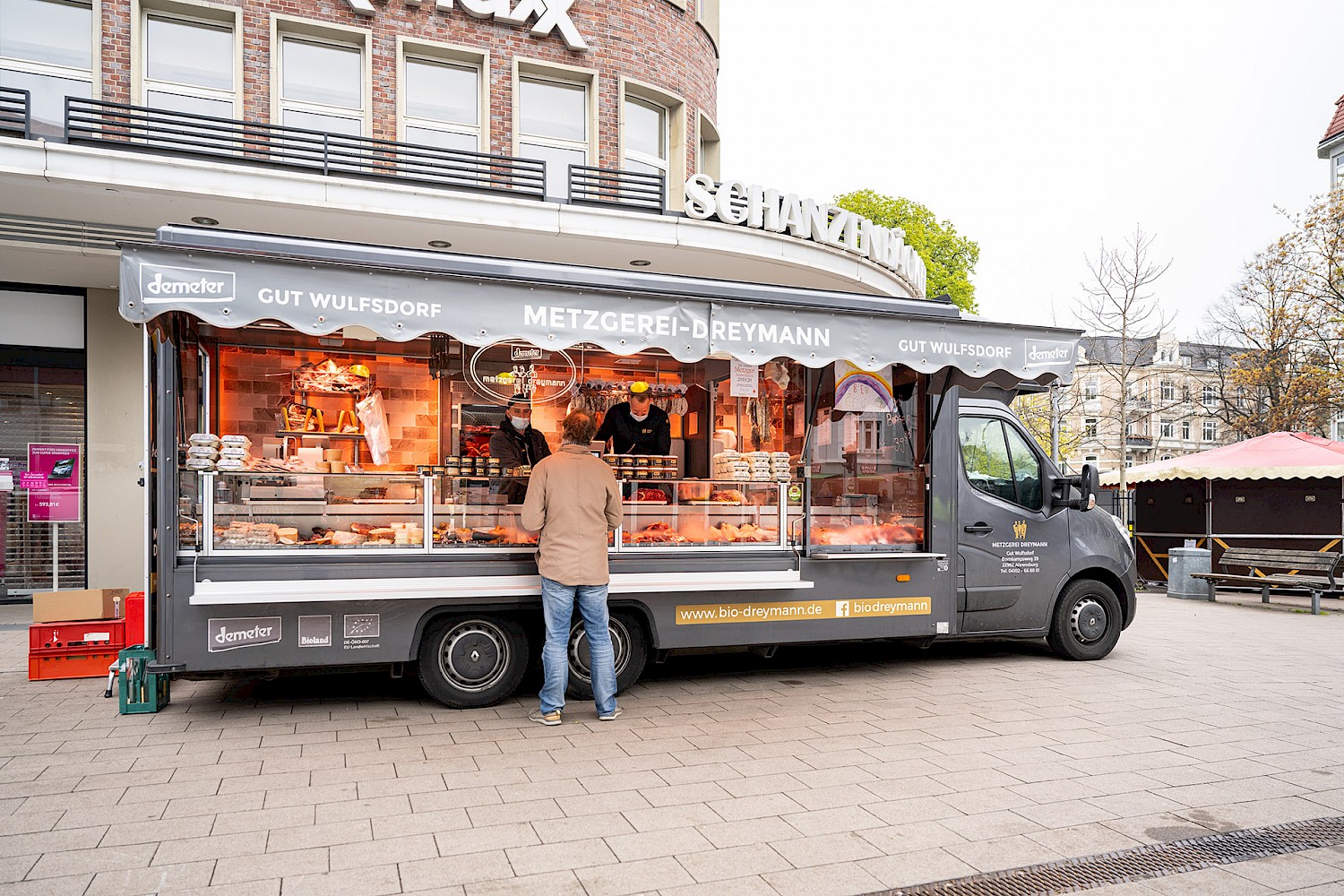 Wir bringen Bio-Fleisch- und Wurstwaren auf den Markt: Mit unseren vier Verkaufsfahrzeugen sind wir täglich unterwegs auf den Hamburger Wochen- und Biomärkten. Unsere Metzgermeister und Fleischsommeliers präsentieren dir an unseren Ständen Fleisch- und Wurstwaren in bester Bio-Qualität von Rind, Schwein, Geflügel und Lamm.